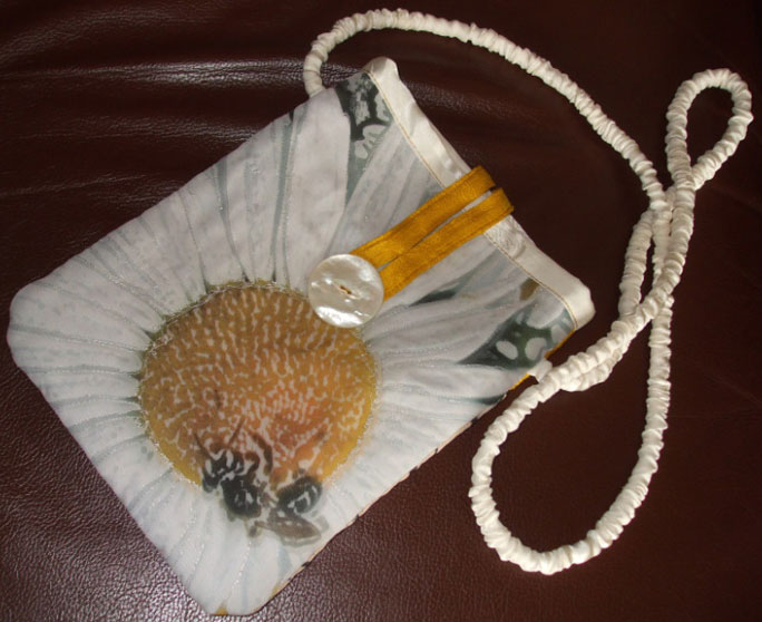 Attached are pictures of a silk purse I made and showed this past weekend at the Dorchester Sandpiper Festival here in New Brunswick, Canada. I received wonderful feedback on it. The front of the purse features a vintage mother-of-pearl button from my grandmother's collection. I printed my photo on both your silk chiffon and silk habotai (paper-backed) sheets. Then I layered them over very lightweight batting before the free-motion work. The back has one sheet of printed silk chiffon layered over the mustard silk. People were amazed at the quality of my colour floral photos printed on silk. Some could not believe they were actual photos from my camera that had been printed with my inkjet printer on silk sheets, and were very curious how the fabric got through the printer. The sheets worked very well for me and I had no problems. The colour reproduction is terrific and I like how the fabric so deeply absorbs the image. I will eventually want to try out your River Silk ribbons since that is another facet of my silk fetish.